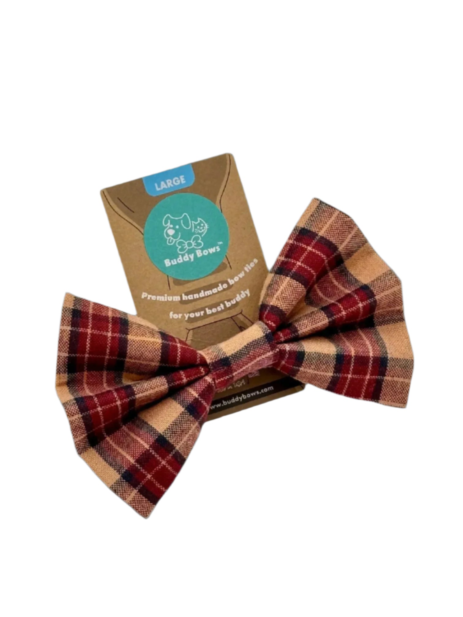 Make your fur baby the star of any occasion with the Brown Tartan bow tie from Buddy Bows™. Designed for style, comfort, and daily life, this adorable pet accessory works with your pet's existing collar and quickly adds a touch of charm to your dog's wardrobe.