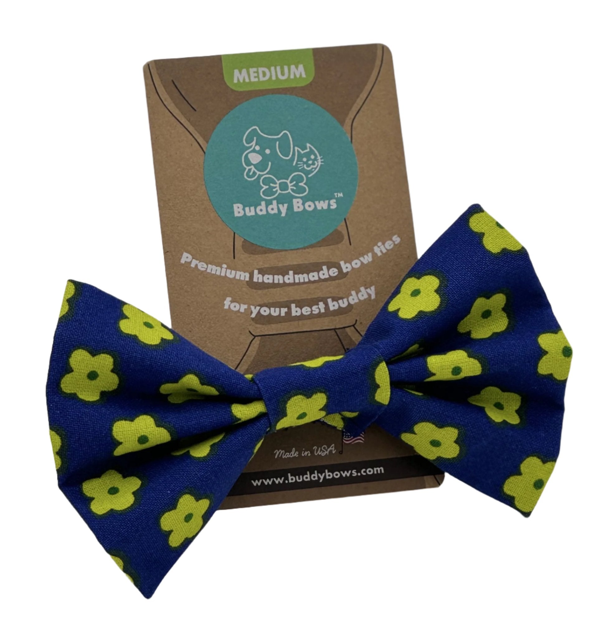 Make your fur baby the star of any occasion with the Navy and Lime Flower Power bow tie from Buddy Bows™. Designed for style, comfort, and daily life, this adorable pet accessory works with your pet's existing collar and quickly adds a touch of charm to your dog's wardrobe.