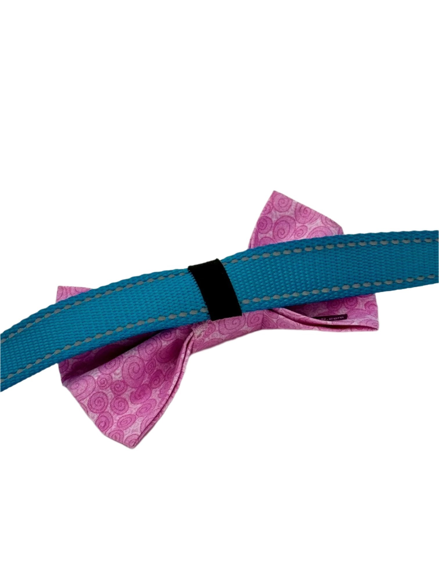 Buddy Bows easily work the collar your dog already loves. Just thread the collar through the extra wide elastic loop on the back of the bow tie to attach it securely.