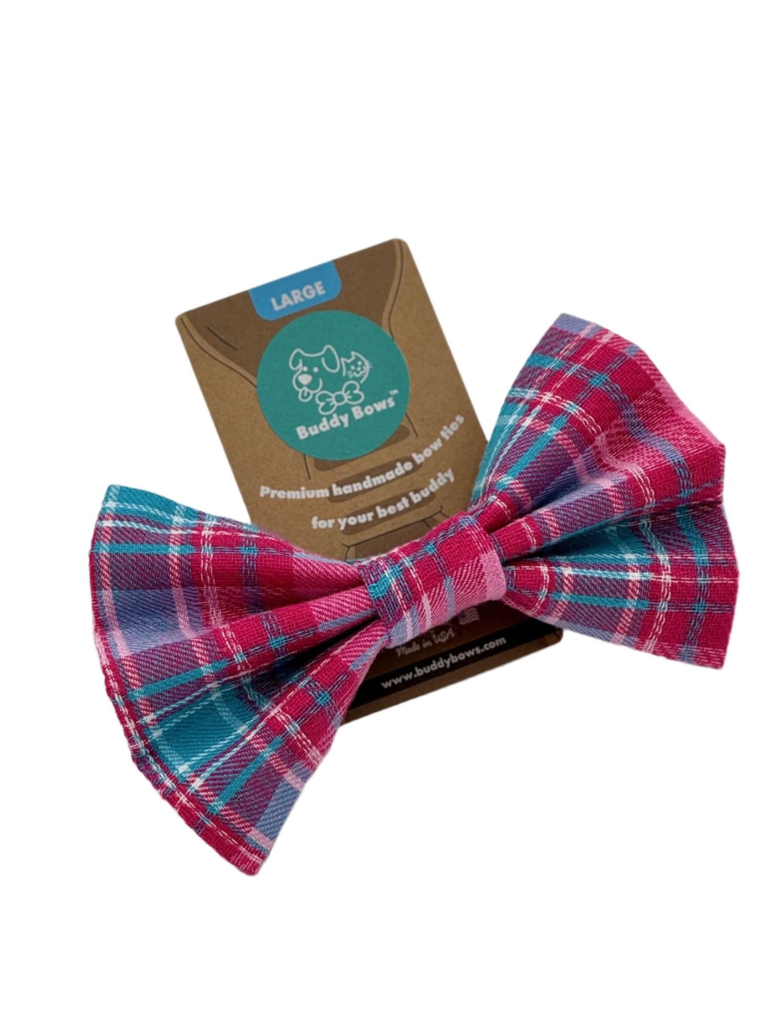 Make your fur baby the star of any occasion with the Pink Tartan bow tie from Buddy Bows™. Designed for style, comfort, and daily life, this adorable pet accessory works with your pet's existing collar and quickly adds a touch of charm to your dog's wardrobe.