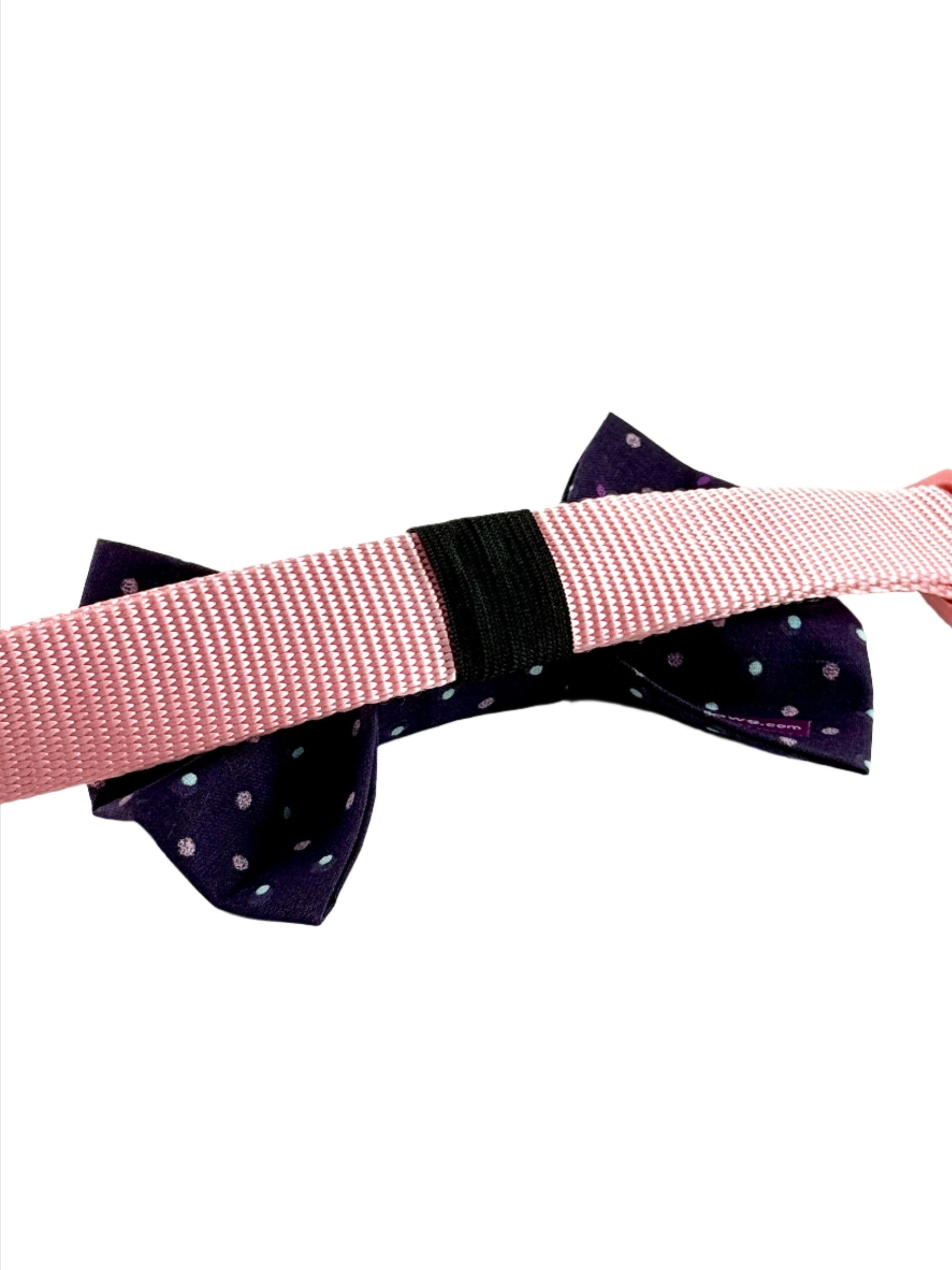 Buddy Bows easily work the collar your dog already loves. Just thread the collar through the extra wide elastic loop on the back of the bow tie to attach it securely.