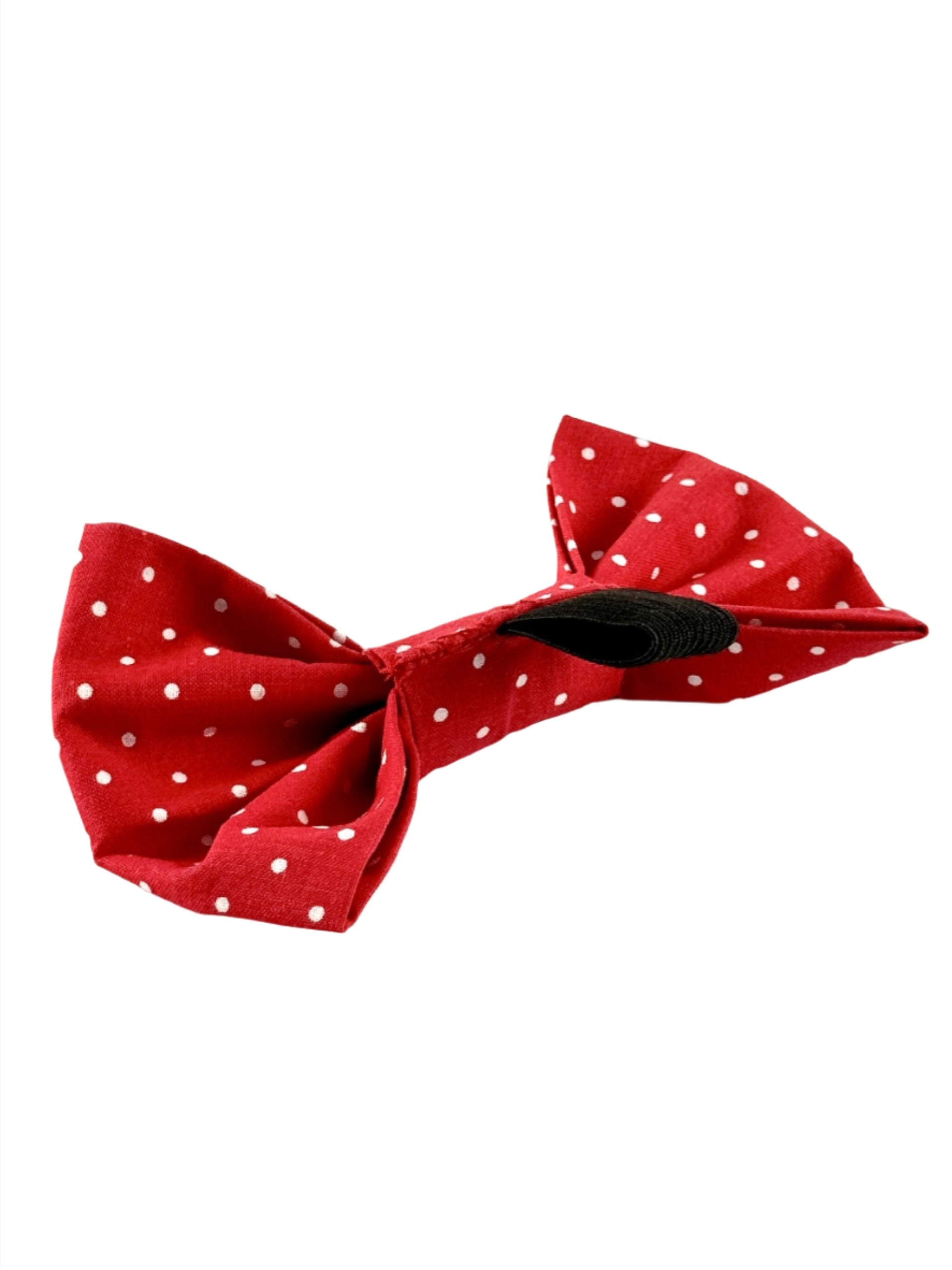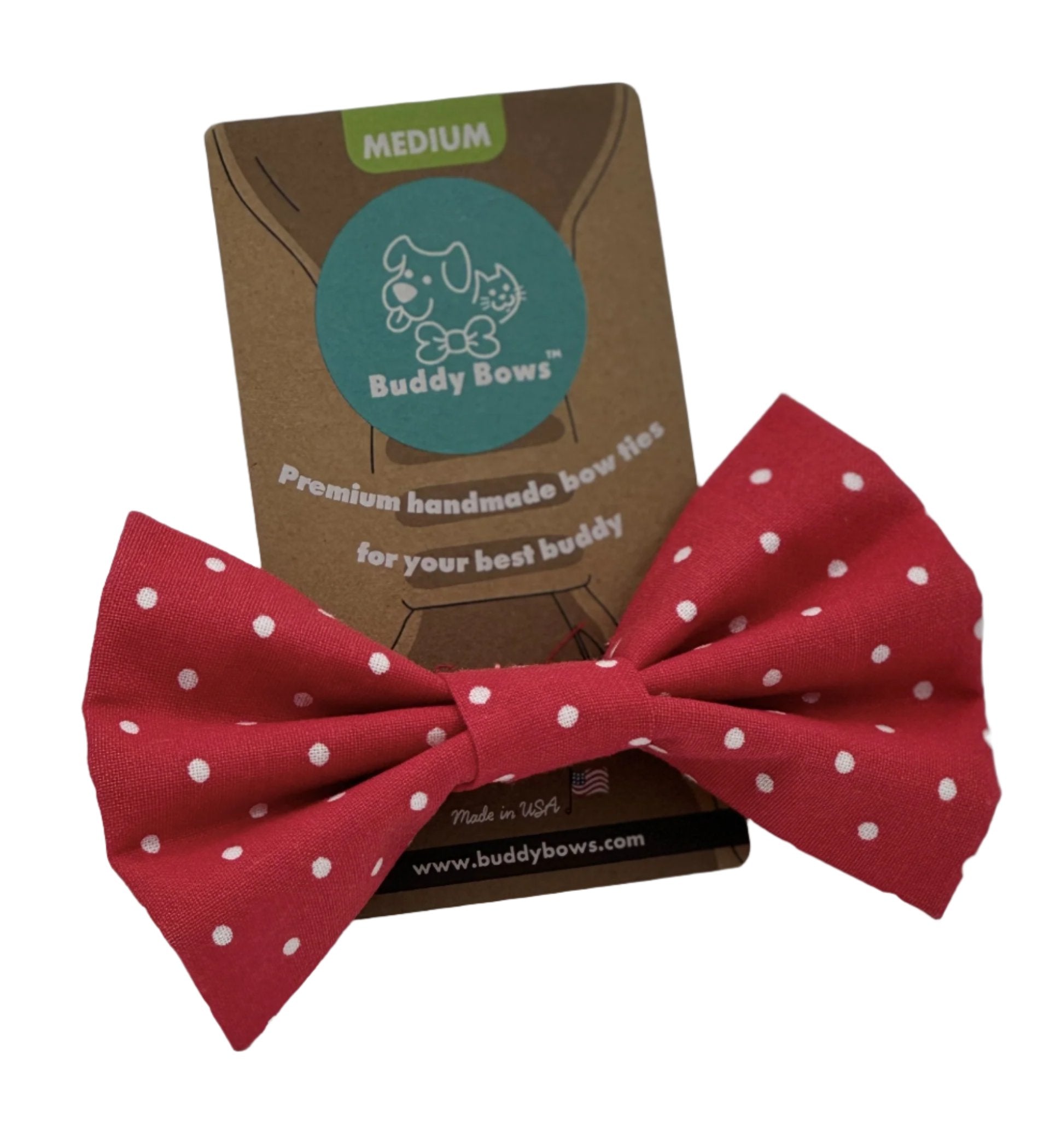 Make your fur baby the star of any occasion with the Red and White Pawlka Dot bow tie from Buddy Bows™. Designed for style, comfort, and daily life, this adorable pet accessory works with your pet's existing collar and quickly adds a touch of charm to your dog's wardrobe.