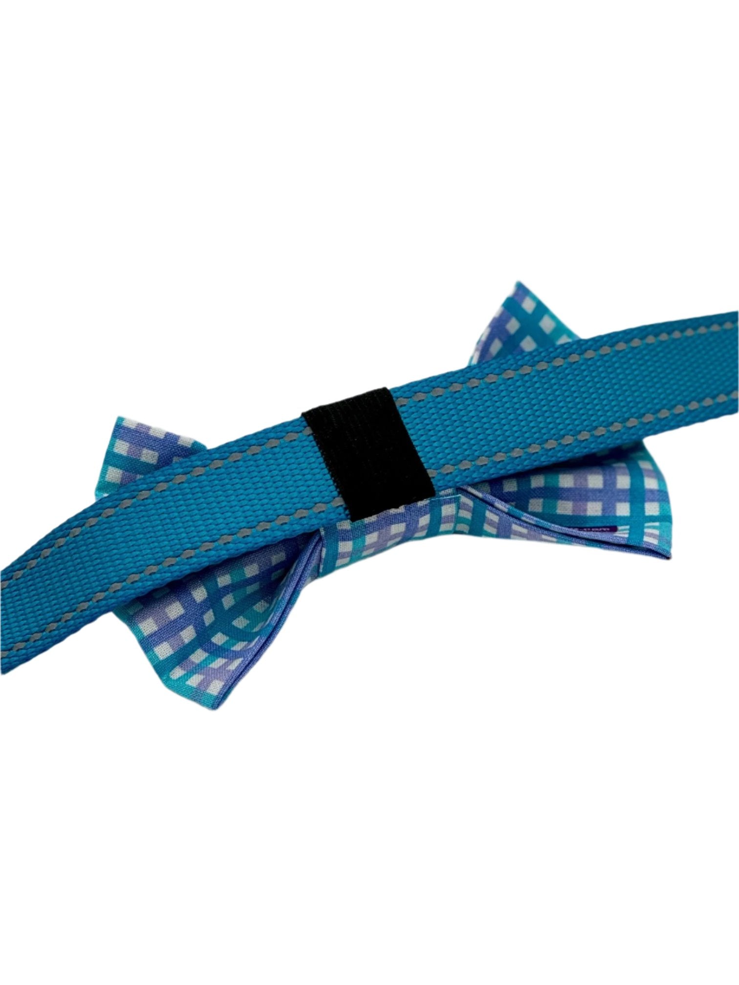 Buddy Bows easily work the collar your dog already loves. Just thread the collar through the extra wide elastic loop on the back of the bow tie to attach it securely.